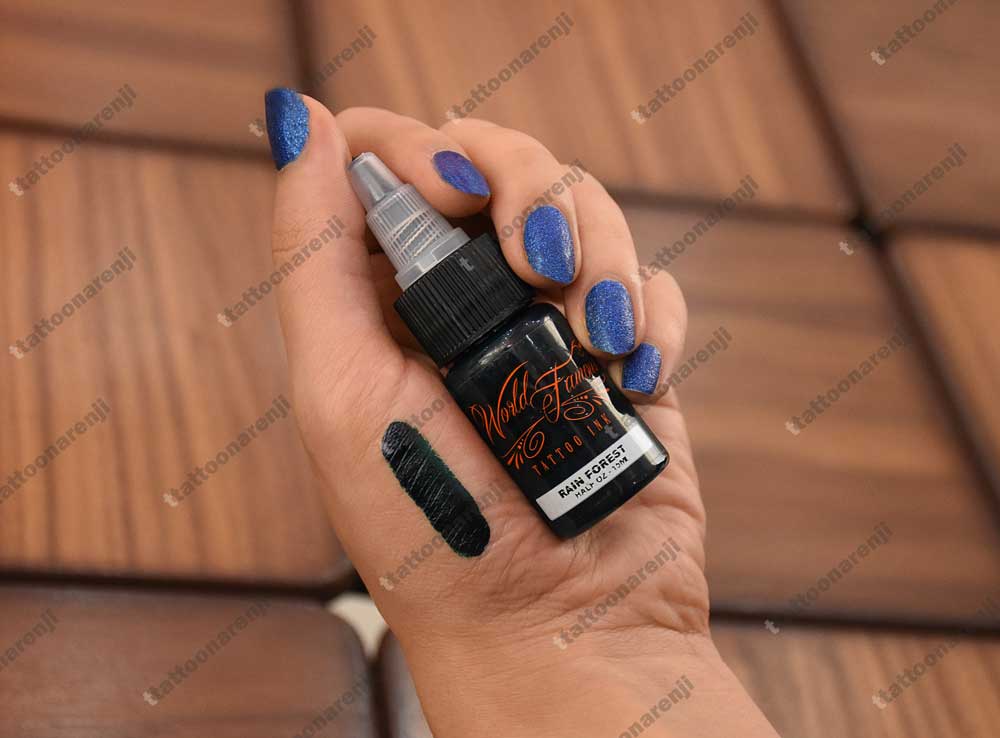 رنگ تاتو رین فارست فیمس Rain Forest از برند وردفیمس، یکی از برترین و متنوع ترین برند های تاتو در دنیا، سبز بسیار تیره و 15 میل است. این رنگ پایه آب دارد و برای تاتو بدن، تاتو صورت و تاتو های آبرنگی مناسب است.